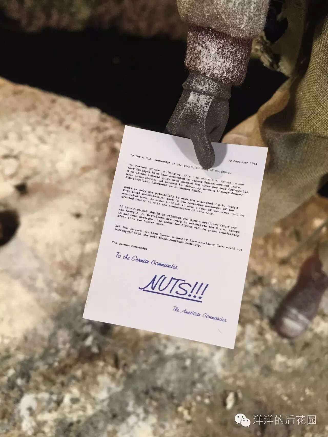12月22日,德军向美军第101空降师师长麦考利夫准将发出劝降信:“这一次,战争的运气在德国人一边,你们已经被强大的德国装甲部队包围。