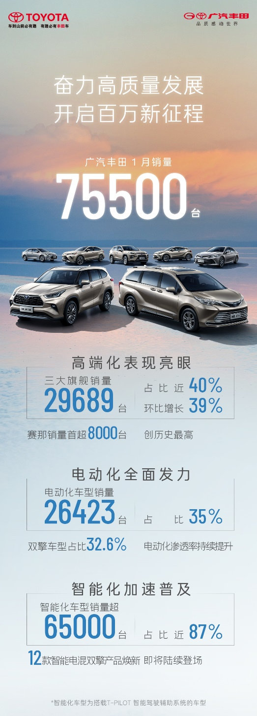 与此同时,广汽丰田高端化表现亮眼,三大旗舰1月销量29689辆,占比近40%,环比增长39%,实现高价值引领。赛那1月劲销8007台,首超8000台,创下历史最高纪录,登顶混动MPV销量榜首。第八代凯美瑞(配置|询价)自2018年上市以来累销超100万台,累计销量1,001,185台,持续领跑中高级轿车细分市场。汉兰达(配置|询价)1月销量7116台,远超同级车型,稳居混动SUV市场NO.1。值得一提的是,锋兰达(配置|询价)自上市以来累销102161台,仅用12个月突破10万台,彰显其超值爆款的巨大潜力。