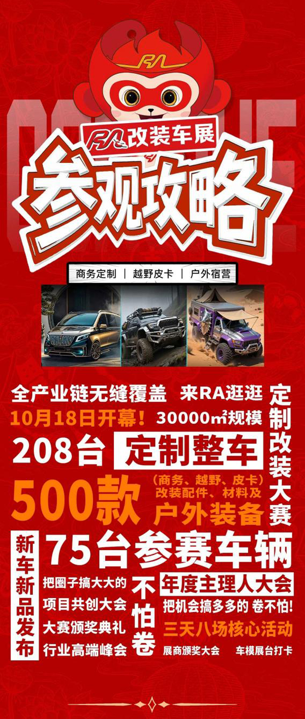 第21届RA上海国际汽车定制改装博览会将于10月18日盛大启幕,本届RA车展形成了商务定制、越野皮卡、旅居房车、宿营户外全品类展出生态。不论你是行业工作者、专业观众,还是改装爱好者,这里都能满足你对改装车和全系配件产品的需求。