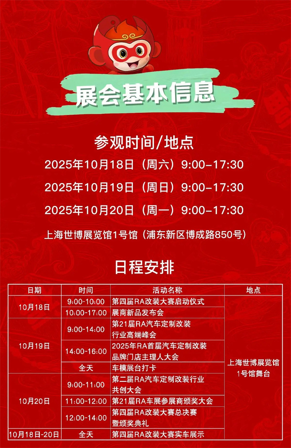 展期连续三天(周六-周一)。现场将集中展示208台定制整车与500款改装配件,覆盖汽车定制改装全产业链。更有第21届RA国际汽车定制改装行业高端峰会,第四届RA改装大赛、第二届共创大会、首届汽车定制改装品牌门店主理人大会、改装大赛总决赛暨颁奖典礼等系列活动在此拉开帷幕!
