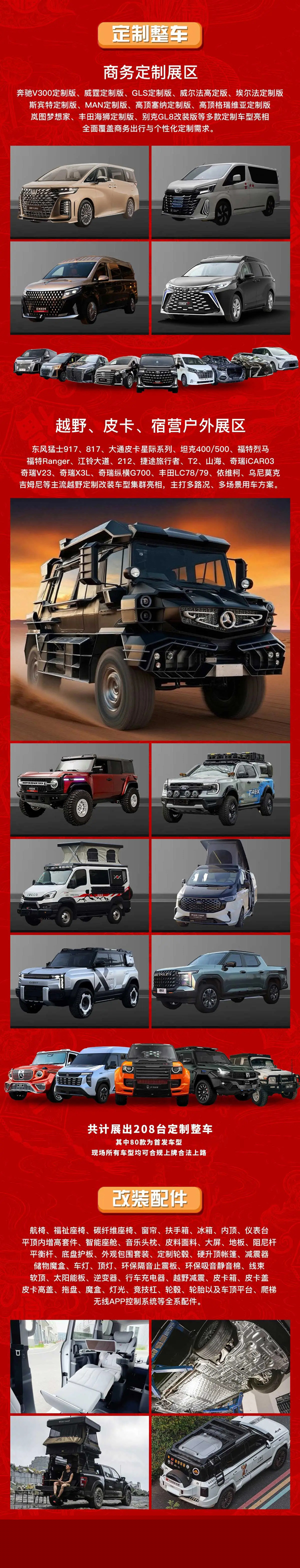 展出配件涵盖航椅、福祉座椅、碳纤维座椅、窗帘、扶手箱、冰箱、内顶、仪表台平顶内增高套件、智能座舱、音乐头枕、皮料面料、大屏、地板、阻尼杆 平衡杆、底盘护板、外观包围套装、定制轮毂、硬升顶帐篷、減震器 储物魔盒、车灯、顶灯、环保隔音止震板、环保吸音静音棉、线束软顶、太阳能板、逆变器、行车充电器、越野减震、皮卡箱、皮卡盖 皮卡高盖、拖盘、魔盒、灯光、竞技杠、轮毂、轮胎以及车顶平台、爬梯、无线APP控制系统等全系品类。