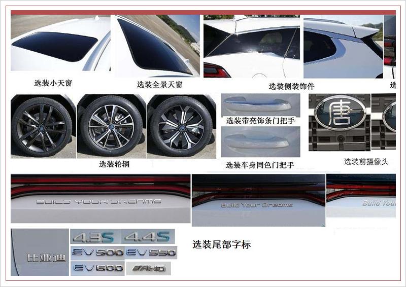比亚迪唐纯电动还提供选装小窗、全景天窗、侧装饰件、轮毂等多项服务。其内饰并未透露更多的信息,据之前曝光的实车图预计,内饰方面有望与全新唐燃油版/插电式混动版车型保持一致,仅在挡把等细节方面进行调整。此外,唐纯电动版提供5座、7座车型,其中7座有望采用“2+3+2”的布局方式。