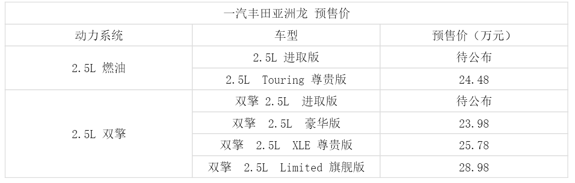 一汽丰田全新中型车亚洲龙将于今晚(3月22日)正式上市,最终售价届时也将公布。不同于同平台的广汽丰田凯美瑞和雷克萨斯ES,国产亚洲龙仅提供2.5L燃油版和2.5L双擎版两种动力。其中,2.5L燃油版中配车型的预计售价24.48万元;双擎版中高配车型的预计售价为23.98-28.98万元。另外,新车还将提供两种动力各自的入门版本。