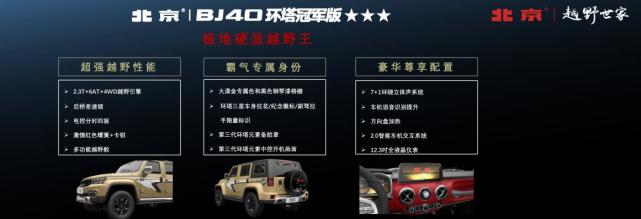 动力上,BJ环塔冠军版搭载的是2.3T+6AT+4WD越野引擎组合,并采用电动分时四驱系统,提升了越野性能。