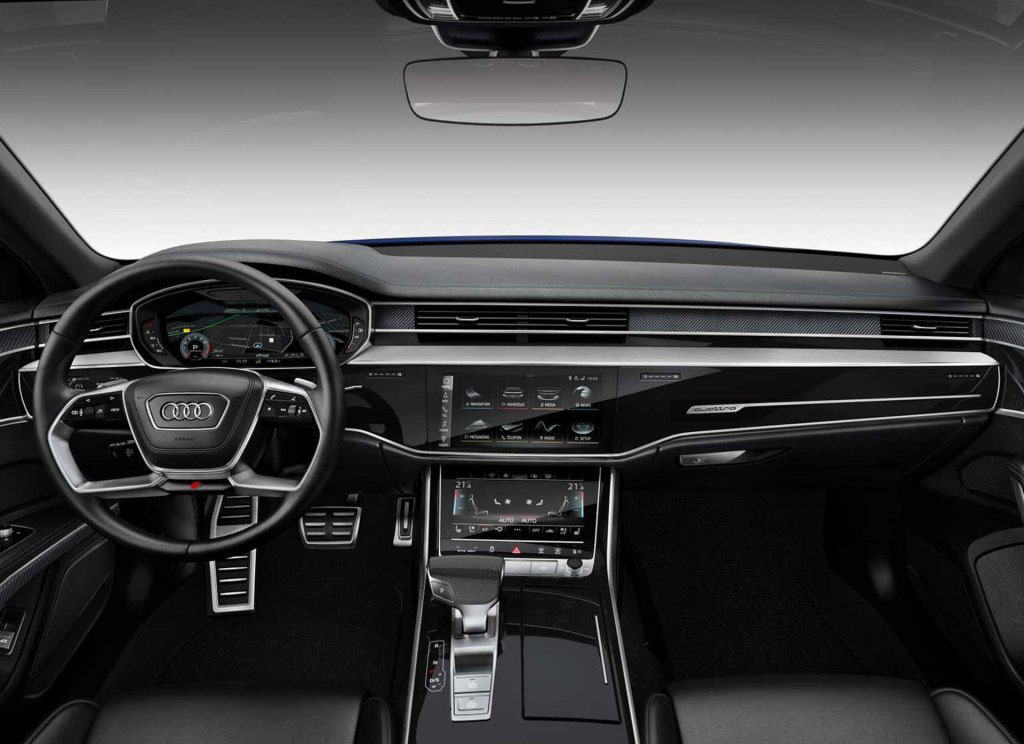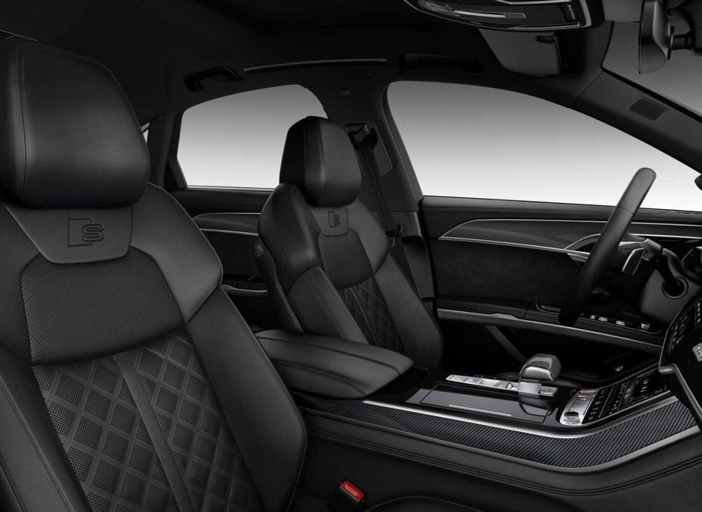 内饰方面,全新奥迪S8内饰整体以黑色作为主色调,大面积的烤漆面板搭配碳纤维饰板也增添了运动性。全新奥迪S8首次使用了四幅式的S风格方向盘,这与此前的车型有所不同。同时新车还配备了带有“S”标识的运动座椅,菱形格状真皮也增添了豪华度。