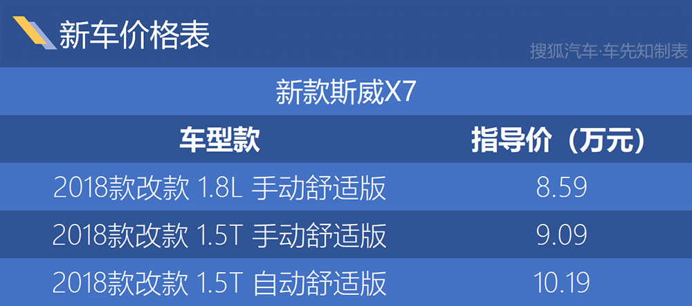 2018款改款斯威X7(参数|图片),在老款车型的基础上减少为3款车型,同时在配置上进行了调整,顶配1.5T自动舒适版增加电动天窗、皮革座椅、鲨鱼鳍天线、新款翼子板标识件、钨金色轮圈和棕黑软内饰。入门级车型1.8L手动舒适型增加电动天窗、皮革座椅、鲨鱼鳍天线、新款翼子板标识件。此外,全系车型减少了外后视镜加热和LED日间行车灯。