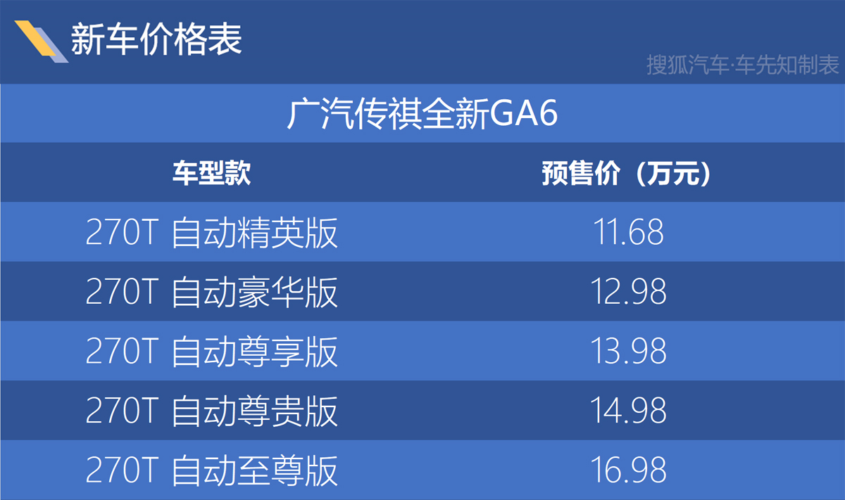 动力方面,全新GA6 270T车型搭载4A15J1型1.5T直列四缸发动机,最大功率169马力,峰值扭矩265牛·米,满足国六排放标准,传动系统匹配6速手自一体变速箱。