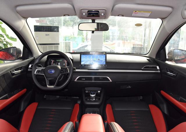 内饰方面,比亚迪e2整体属于较为简洁的设计语言,中控台采用平直的线条进行修饰,搭配多边形的空调出风口、全液晶仪表以及10.1英寸中控大屏,中控台上并没有过多的物理按键,大多数功能都被集成到中控大屏进行控制。而细节处比如空调出风口以及挡把周围等,加以镀铬材质进行装饰,配合三辐式多功能方向盘,整体内饰风格偏向年轻化。