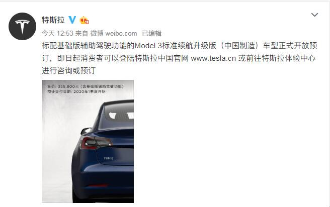 日前,据@特斯拉 微博官方账号消息,特斯拉公司宣布标配基础版辅助驾驶功能的Model 3标准续航升级版(中国制造)车型正式开放预订。