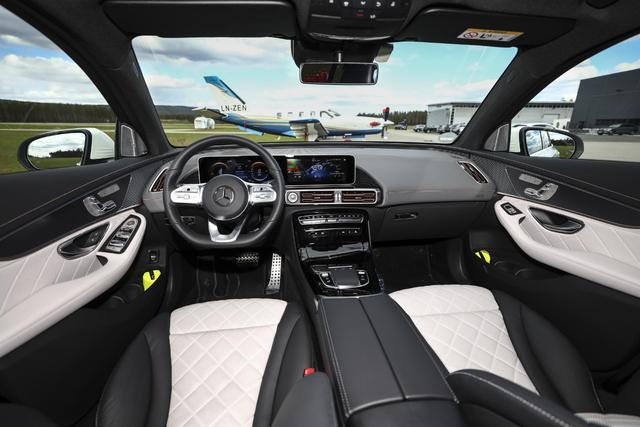 EQC还配备双10.25英寸显示屏作为仪表盘和中控大屏,内置标配的MBUX车机系统,两块屏幕相连的设计凸显科技感。同时,新车还搭配了多功能方向盘,在周围镀铬材质的装饰下触摸手感更强。