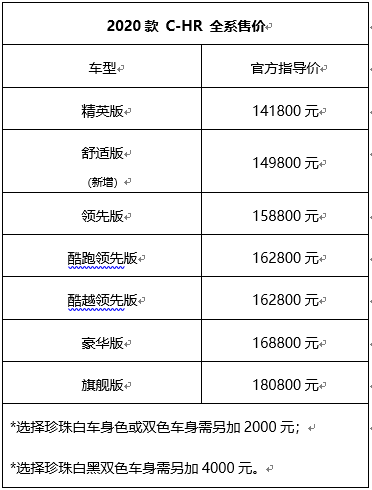 2020款C-HR全系包括旗舰版、豪华版、领先版、舒适版及精英版五款车型,均满足“国六B”排放标准,全系列官方指导售价14.18万-18.08万元,即日起全面发售。广汽丰田针对2020款C-HR推出最高5成首付2年0利率的金融政策,助力消费者轻松拥有高价值SUV。