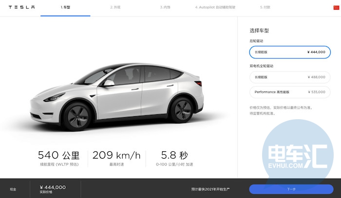 根据官网信息,Model Y将于2021年生产,但是按照特斯拉上海工厂的速度,相信Model Y将最早于2020年年底可实现量产和交付。近日,特斯拉中国官网的Model Y价格也已经公布:44万起,特斯拉上海工厂二期项目也早已动工。