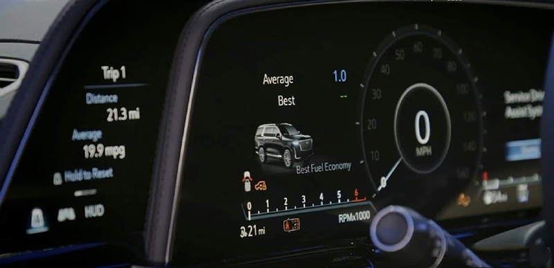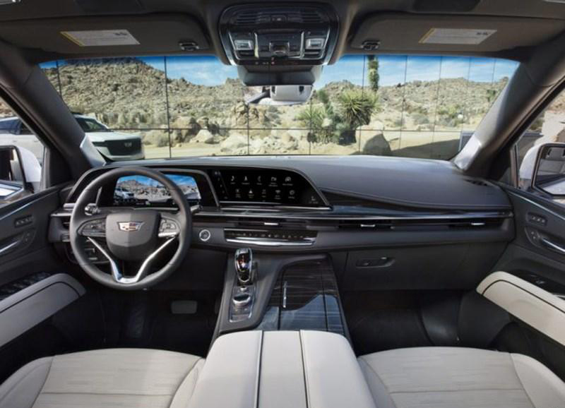 在内饰方面,新车首次在量产车上采用了OLED曲面玻璃,其仪表和中控屏融为一体,官方称这块屏幕的对角线长度超过38英寸,像素是4K电视的两倍。此外,得益于超大尺寸屏幕的使用,全新凯雷德的车内取消了大量的物理按键,诸多功能性操作通过三个分屏进行,分别是驾驶员左手的7.2英寸屏幕,主要展示部分行车信息;驾驶员正前方的14.2英寸屏幕,主要展示速度、 导航信息等;中控台上方的16.9英寸屏幕则主要以娱乐系统的信息为主。