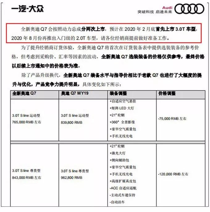 近日,网络上曝光了一份奥迪厂家发给经销商的新款Q7预售资料,其中透露了一些关键信息。