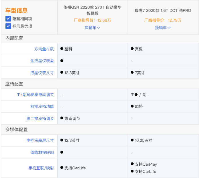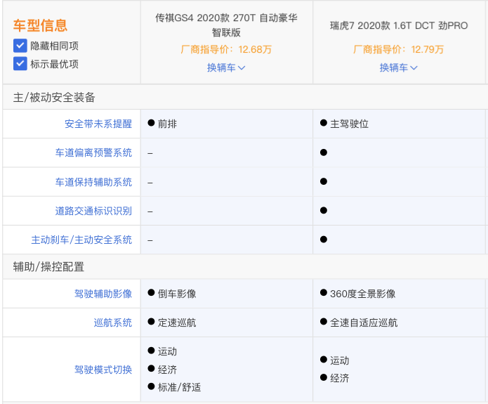 为了给该网友更多地选择空间,小编横向对比了多款中国品牌紧凑型SUV后发现,今年刚刚上市的全新一代奇瑞瑞虎7也是不错的选择。随后,小编通过汽车之家“车型对比”(广汽传祺GS4 自动豪华智联版/奇瑞瑞虎7 1.6T DCT 劲PRO)两款价位相当的车型的各细项,奇瑞瑞虎7 PRO性价比尤为之高。