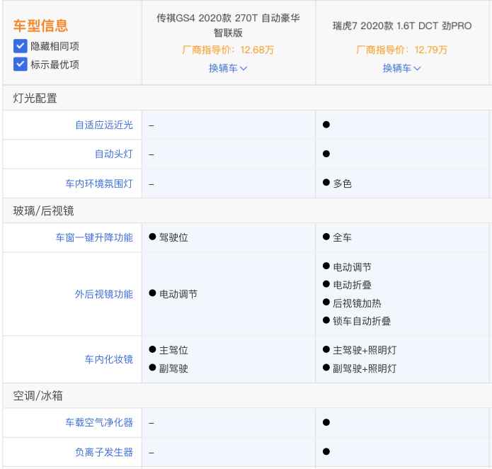 安全配置,档次感的配置,GS4可以说是全线沦陷。但是,还没完。自动大灯、自适应远近光灯和车内多少氛围灯,瑞虎7全具备,GS4一项都没有。全车车窗一键升降,外后视镜的功能全面性,GS4都不及瑞虎7。最后,疫情影响下,购车者对健康类配置关注度持续攀升,车内空气安全和健康成又一考量重点瑞虎7装配了“车载空气净化器”和“负离子发生器”,而GS4仅有“车内PM2.5过滤装置”。