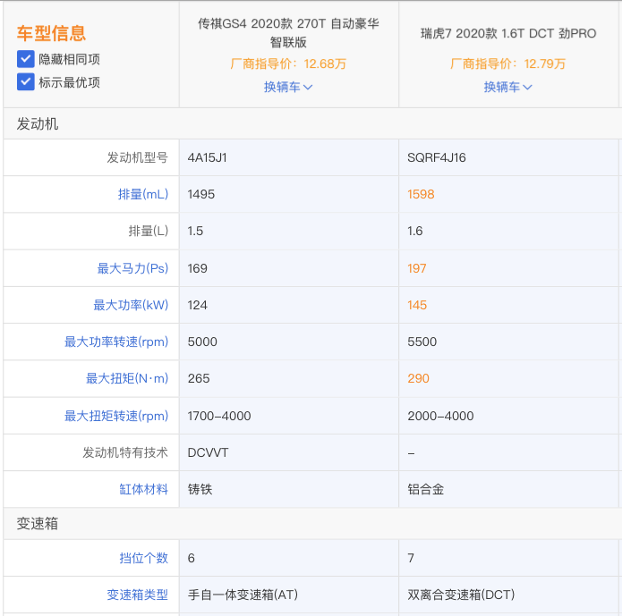 瑞虎7以1.6T动力对比传祺GS4的1.5T动力,本就不公平,毕竟排量稍大,所以瑞虎7的最大马力和最大扭矩,都优于GS4。