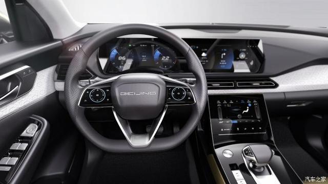 内饰方面,BEIJING-X7采用了颇具科技感的座舱设计手法,在保留概念车耀的元素之外,BEIJING-X7还加入了更多的细节设计。新车最引人注目的就是其搭载的贯穿在中控面板的全液晶仪表和中控大屏以及下方的空调区域的触摸屏,三块屏幕联动很好的提升了新车车内的科技感。同时,其还采用了官方称为全息触控的多功能方向盘,整体造型看上去也较为运动,两侧触摸式的多功能按键造型也颇有新意。在细节方面,整车的按键、按钮及门把手等,都采用了银色处理,再加上中控部分的黑色钢琴漆面板,高级感很好的得到了体现,也使其内饰看上去很有档次。