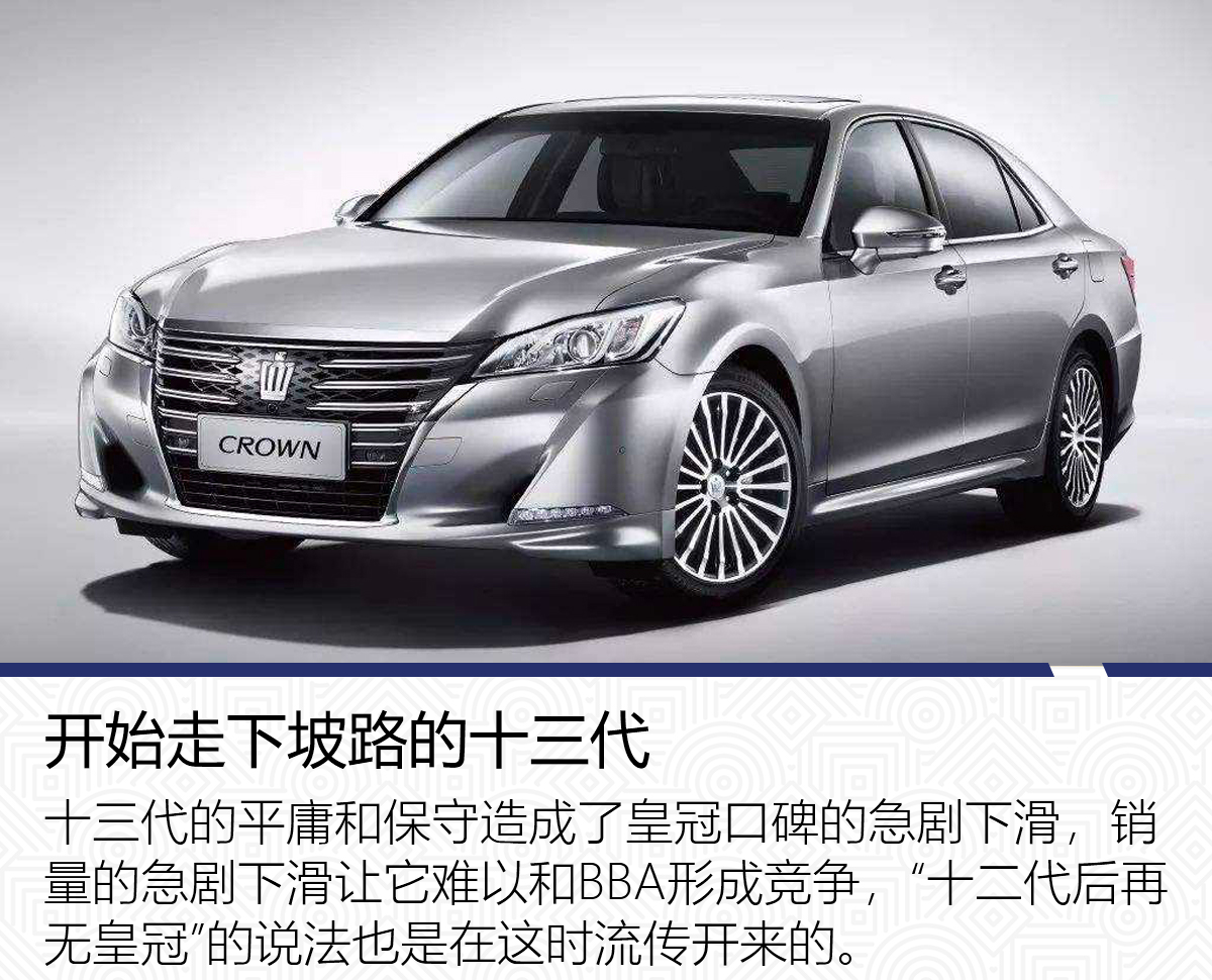 2009年,十三代皇冠上市,进一步了扩大车体,依旧是那款六缸发动机,日式贵族范儿还在,只要你有钱,甚至可以选择90万的4.3L V8发动机旗舰车型。但相较于十二代,十三代的平庸和保守造成了皇冠口碑的急剧下滑,销量的急剧下滑让它难以和BBA形成竞争,“十二代后再无皇冠”的说法也是在这时流传开来的。