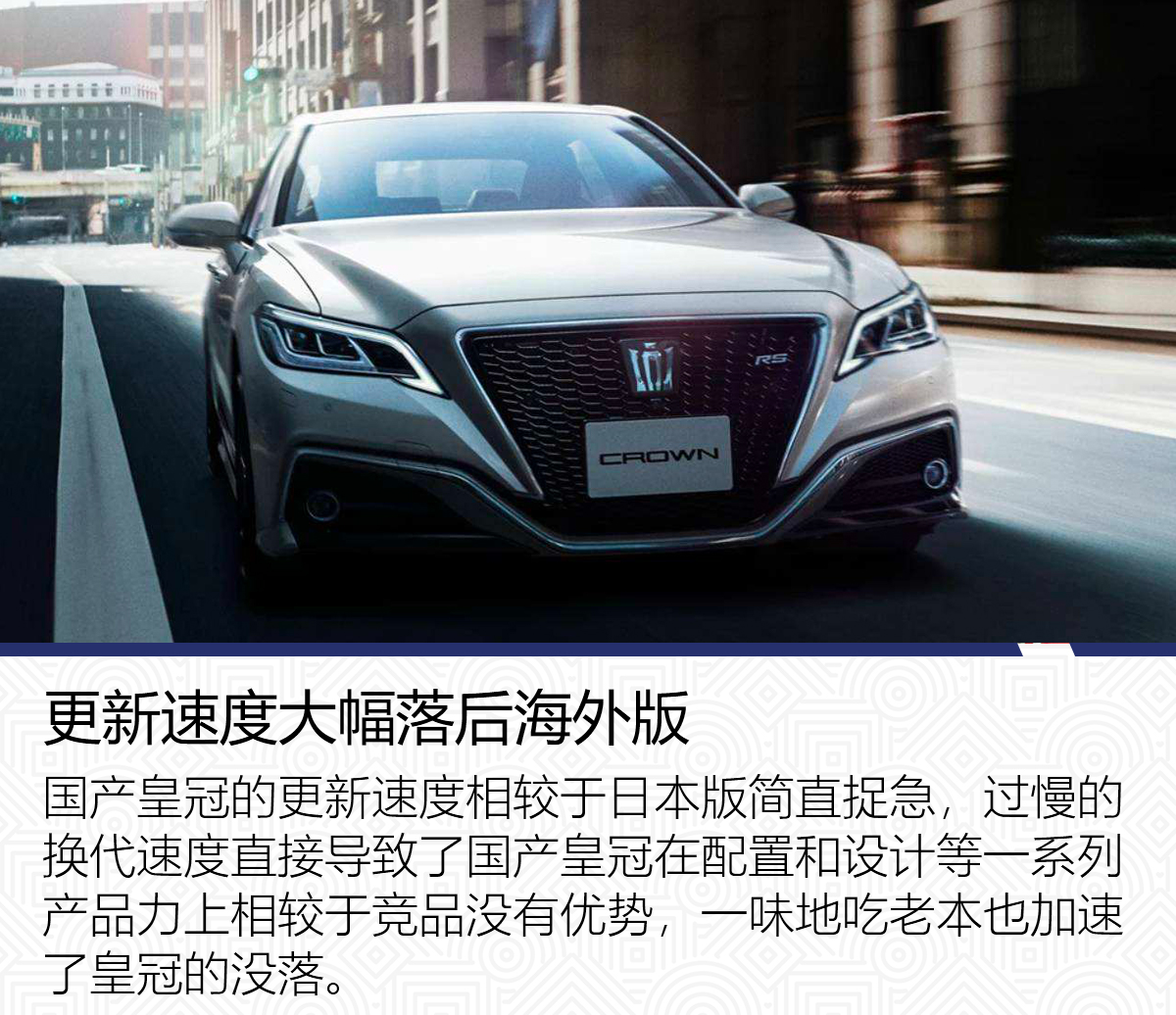 其次,与日本本土皇冠的更新换代速度相比,国产皇冠的换代速度实在不敢恭维。过慢的更新速度直接导致了无论是产品、设计还是技术,都无法和当下同级别的竞品进行竞争。本身近两年汽车市场就在下行趋势中,激烈的竞争下各家都在拿出看家本领。而老派的皇冠依旧试图靠吃老本来获得市场,结果当然和罗永浩老师差不多。情怀很美好,但是不能当饭吃。