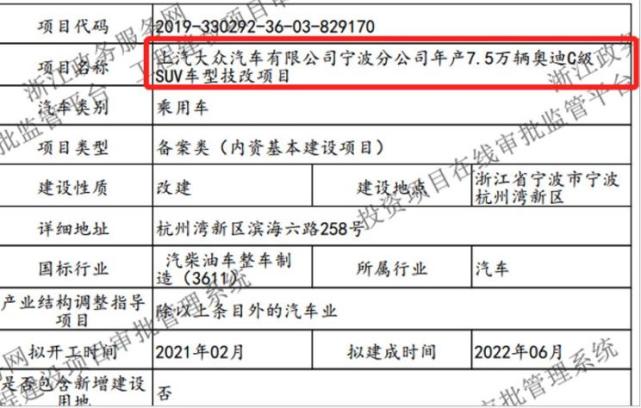 日前,有国内媒体曝光了一组上汽大众汽车技改项目文件,文件中显示,上汽奥迪中大型(C级)SUV车型将落户宁波工厂二期工厂,年产能达7.5万台。同时,上汽奥迪中大型(C级)SUV车型技术改造时间为2021年2月,项目建成时间为2022年6月,这也与此前上汽大众官方表示的2020年前并不会销售奥迪产品的时间吻合。值得一提的是,目前奥迪旗下汽/柴油中大型SUV仅有Q7、Q8两款车型,具体未来将会国产哪款,还有待官方进一步公布。