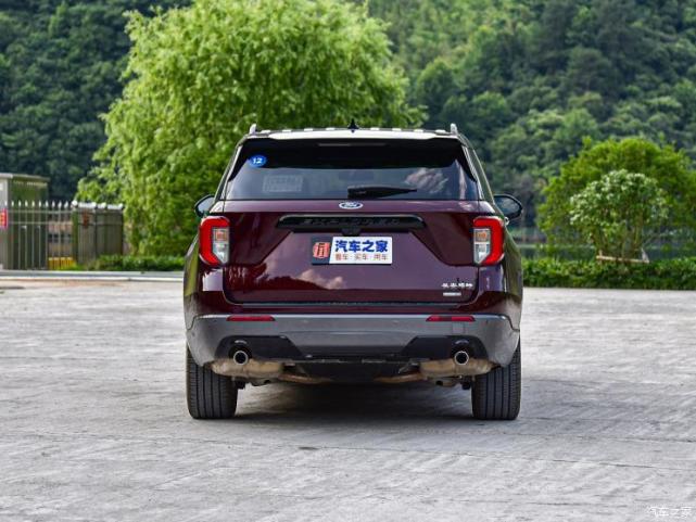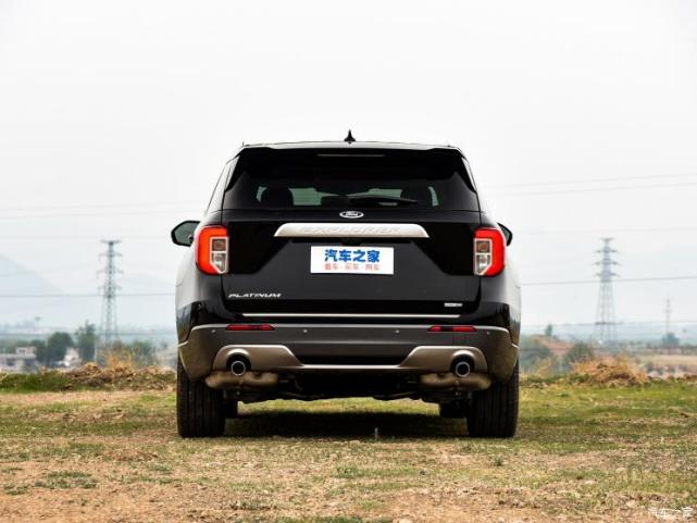 车尾部分,新车整体设计较为简洁,梯形牌照区域上方采用了一个大面积的镀铬/亮黑的装饰条,并在上面印有Explorer英文字样,提高该车的辨识度;另外,新车全系采用了双边共两出的排气设计。