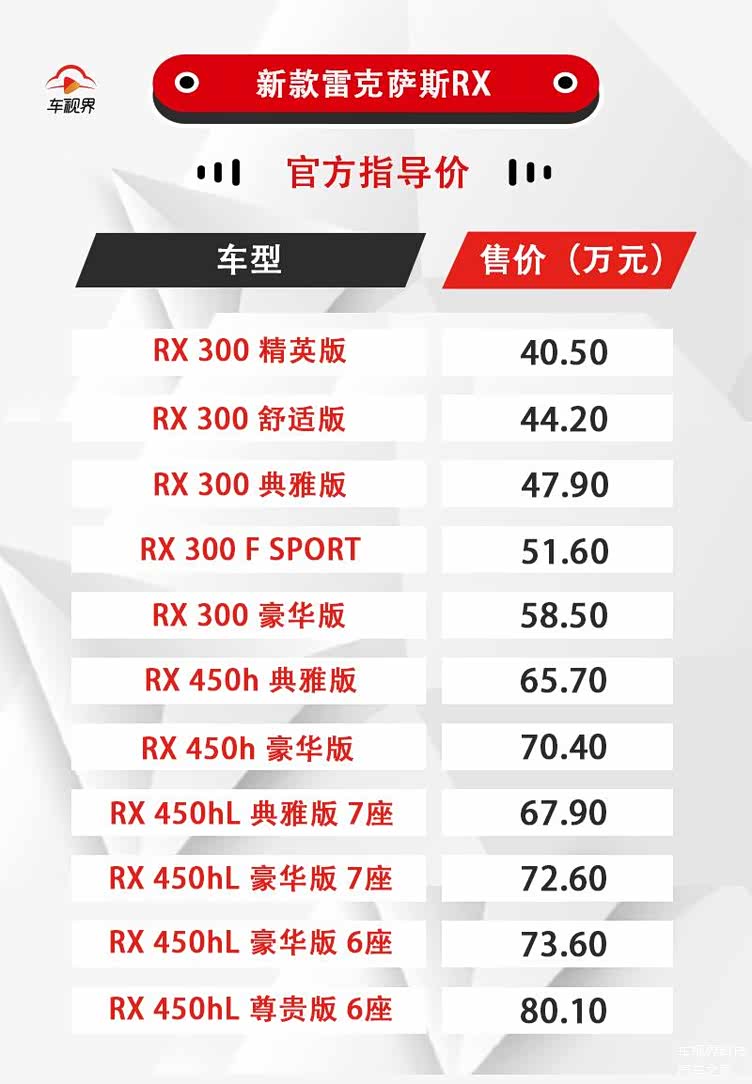 近日,我们从雷克萨斯官方获悉,新款RX车型正式上市,共推出11款车型,售价区间为40.50-80.10万元。可能是因为配置的增加,全系车型的售价都有小幅上调。