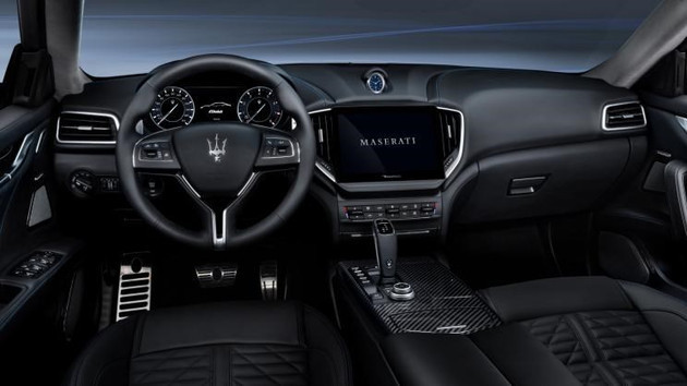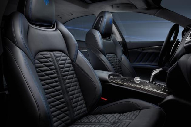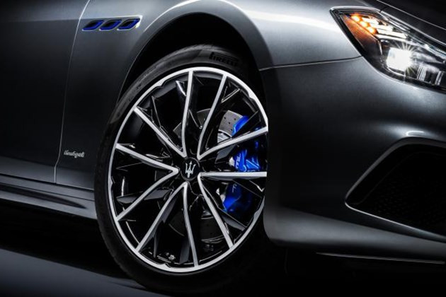 新车基本延续了现款车型的造型设计,仅在细节方面进行了调整,面积巨大的进气格栅搭配三叉戟LOGO让车头显得十分霸气,下进气格栅两侧的导风口象征着新车的运动属性。细节方面,新车前翼子板上的散热口与C柱上玛莎拉蒂的LOGO都带有蓝色元素,而且制动卡钳也喷涂成了蓝色样式,象征着新车的混动身份。