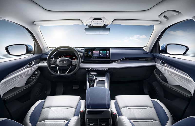 从发布的官图来看,吉利PREFACE内饰采用了全新的“时空交叠座舱”造型设计,整体线条十分流动、简洁,视觉效果时尚、科技。具体来看,新车使用了游艇蓝与高级灰配色,搭配平底三辐式多功能方向盘、12.3英寸液晶仪表、悬浮式12.3英寸中控大屏,质感突出。