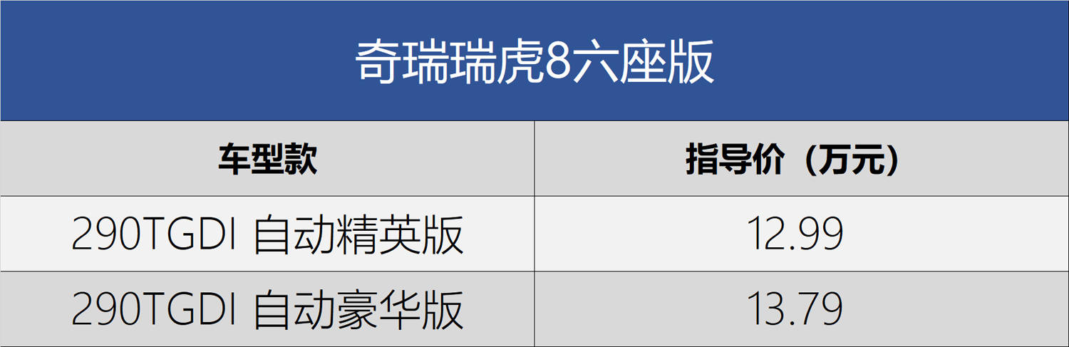 近日,我们从相关渠道获悉,奇瑞瑞虎8六座版正式上市,新车指导价区间为12.99-13.79万元。针对这款6座版本车型,奇瑞官方还推出了包含10000元现金优惠、至高10000元置换补贴以及5000元金融补贴(限时)的综合优惠。