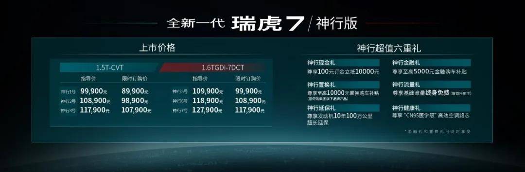 9月3日,奇瑞汽车旗下全新一代瑞虎7神行版正式上市。此次新车发布包括1.6T+7DCT和1.5T+CVT两种动力组合,共6款车型,官方指导价为9.99-12.79万元。为了向广大消费者提供更高质价比的驾享体验,奇瑞汽车特推出神行超值六重礼。11月30日前100元订金立抵10000元,1.5T神行版车型限时订购价低至8.99万元起,1.6T神行版车型限时订购价低至9.99万元起!同时,还可享受神行金融礼、神行置换礼、神行延保礼等多重礼遇。