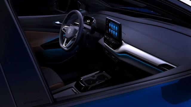 内饰方面,ID.4整体将采用相对简约的风格,并且采用尺寸较大的中控液晶屏。值得一提的是,新车风挡下方的灯条可以根据车辆以及交通情况,来发出不同颜色的灯光信号。另外,ID.4还可选装大型倾斜玻璃天窗,并拥有30种照明颜色可以调节。