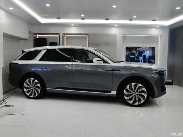 车身侧面,新车采用了双色车身的搭配,并沿着车顶线条镶嵌了一根镀铬装饰条,C柱的位置搭配了一个电量显示器。另外,宽大平直的车身侧面与宽厚的轮眉,搭配22英寸多条辐轮圈,让新车的气场提升了一个档次。
