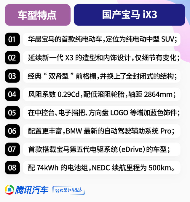 11月20日,2020广州车展正式开幕。国产宝马iX3纯电动中型SUV正式上市,新车推出了2款车型,市场价格为46.99万元-50.99万元。新车延续了燃油版X3的外观和内饰设计理念,不过细节上均有进行纯电动车元素的升级,并配有BMW最新的自动驾驶辅助系统Pro,以及搭载了第五代电驱系统(eDrive),NEDC续航里程为500km。