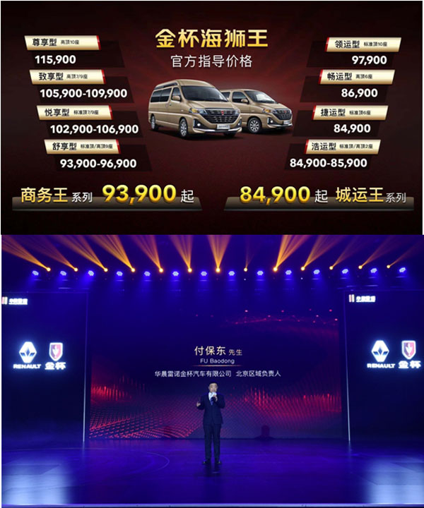 11月29日,华晨雷诺金杯合资后首款LCV——金杯海狮王北区上市发布会在北京举行。新产品分为城运王和商务王两大系列,其中城运王系列售价为84,900元-97,900元,商务王系列售价为:93,900元-115,900元。