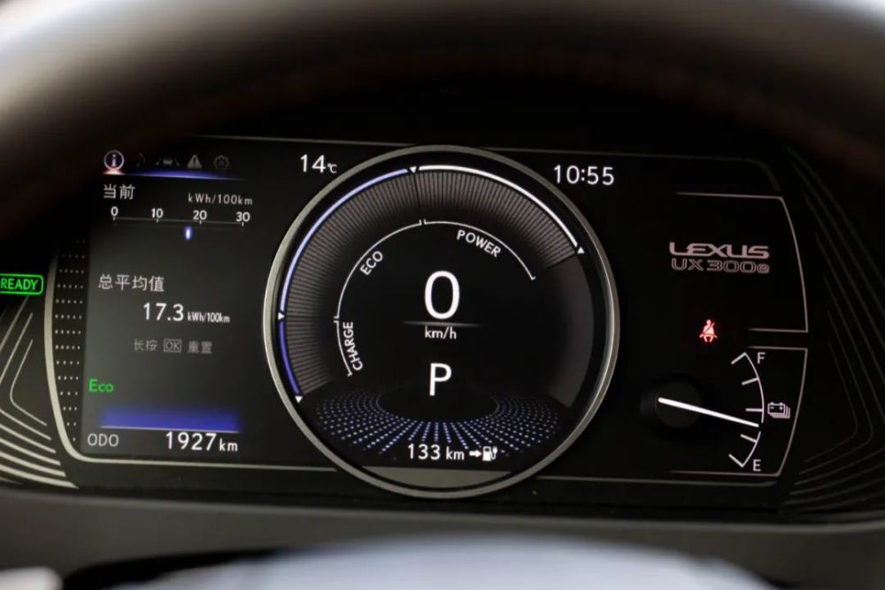 相比燃油版车型,UX 300e增加了B挡,即能量回收挡,能量回收的力度可以通过方向盘后方的拨片获得四个挡位的调整。不过,就算将能量回收调至最强,也不能实现单踏板行驶,依然需要通过刹车踏板来进行制动。
