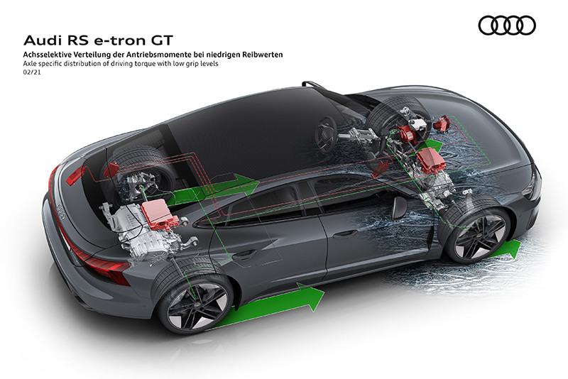 动力部分,奥迪RS e-tron GT采用了电动四驱系统驱动,只有奥迪驱动在“效率”模式下选择动态处理系统时优先使用前轮驱动。RS车型的前后轴均搭载了永磁同步电机(PSM),其中前轴电机的最大功率为175kW(238Ps),后轴电机则为335kW(456Ps),同时后轴还配有两速变速器。