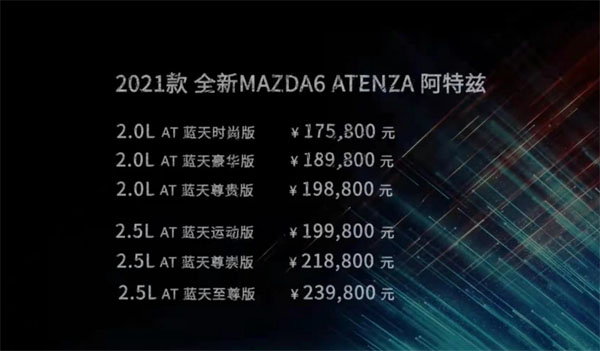 2021年3月12日,一汽马自达2021款全新MAZDA6 ATENZA 阿特兹正式上市。全新产品实现了科技装备的全方位升级,带来领先同级的智能安全享受,并进一步向主力车型转移,最高增配13000余元,大大降低了科技配置的准入门槛;同时产品加工精度也全面升级,整车操控质感再次提升,让更多的用户都能享受到更超值的产品,体验更纯粹的驾驶乐趣。