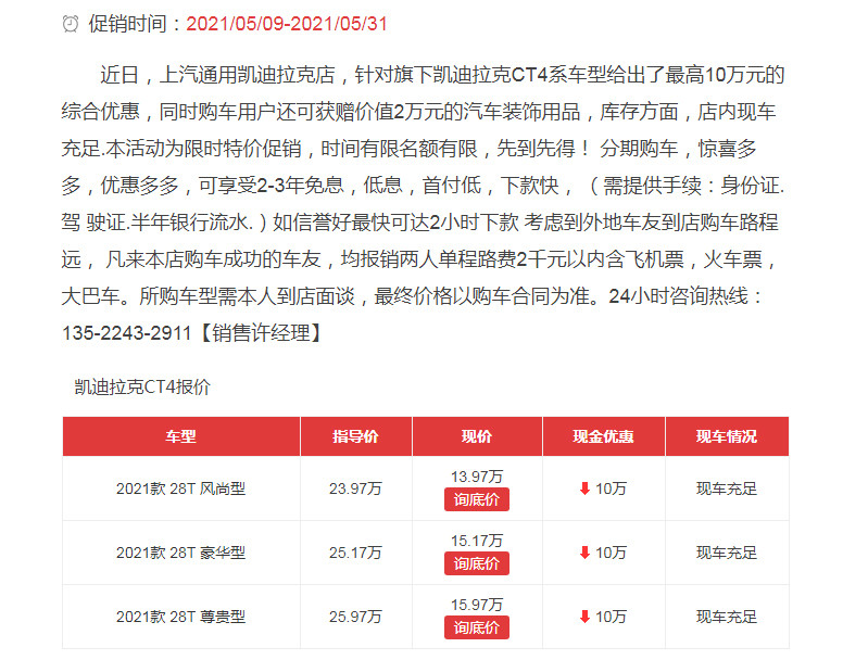 罗辑车评近日从经销商处获悉,有凯迪拉克经销商对CT4系列车型给出了最高10万元的综合优惠。