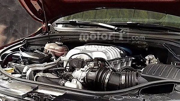 The sole under-hood photograph is a little grainy but there’s no mistaking the supercharger sitting on top of the engine. The layout in there looks quite similar to other applications of the Hellcat.