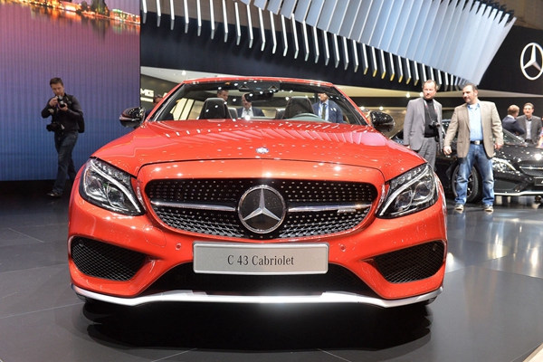 奔驰在日内瓦车展发布了新款C级敞篷车,该车将于今年夏季在美国上市。该车基于C级轿跑车,采用电动折叠软顶,在车速31英里(约合50公里)一下时可在20秒内打开或关闭。车辆内装布局与轿跑车类似,只不过增加了Airscarf颈部暖风系统,折叠软顶控制键采用哑光银色镀铬表面。选装件包括热反射真皮座椅等。美版车型提供两种引擎,其中入门级的C300搭载一台2.0升四缸涡轮增压引擎,功率241马力,扭矩273磅-英尺(约合439牛米),搭配9G-TRONIC自动变速器,可选装4MATIC四驱系统。车辆0-96公里/小时加速时间6.3秒,最高时速130英里(约合209公里)。奔驰-AMG C43搭载一台3.0升V6双涡轮引擎,功率362马力,扭矩384磅-英尺(约合520牛米),搭配9G-TRONIC变速器和偏后轮全驱系统。车辆0-96公里/小时加速时间4.7秒,最高时速155英里(约合250公里)。在欧洲销售的车型将增加更多引擎,包括170马力四缸柴油引擎和V6引擎。